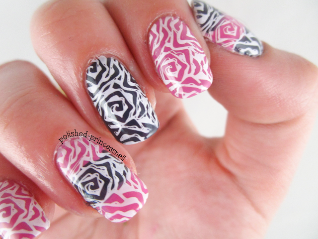 Today's nails include a technique that I have only tried a couple of times - a radial gradient (where the gradient works outwards from the centre of the nail, rather than horizontally or vertically across the nail). I found it really difficult to get consistent gradients across all ten fingers, but I'm pretty happy with the results anyway. I added a pretty circular-style stamped image, and of course I had to stick some sparkly gems on there too!